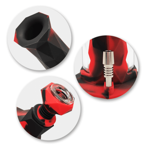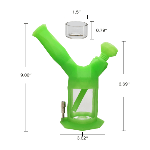 The flexible silicone body surrounds a thick glass water chamber that easily pops in and out for quick filling and cleaning without leaking out. The combination of silicone and glass design not only solves the problem of easily broken glass, but also makes the smoke volume visible in smoking rigs.